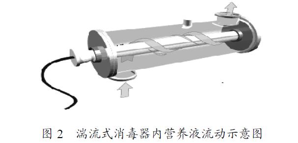 針對上述問題,自行設(shè)計了一種新型的紫外線消毒器[17]:在消毒腔體內(nèi)安裝螺旋形導(dǎo)流片,使?fàn)I養(yǎng)液以湍流形式流動(圖2),即讓沿不銹鋼腔體內(nèi)壁流動的營養(yǎng)液也有一部分時間是在石英套管附近流動。營養(yǎng)液在距離紫外燈管較近或較遠(yuǎn)的兩個區(qū)域停留的時間接近,從而解決了因一部分營養(yǎng)液滅菌不徹底而影響整體滅菌效果的問題。