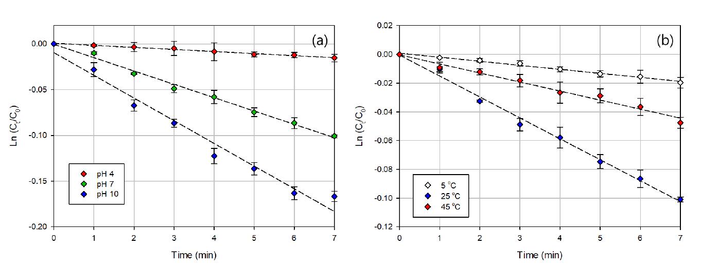 我們在各種pH值下應(yīng)用了納米臭氧/ H2O2反應(yīng)來降解合成廢水中的TMAH(圖3(a))。 TMAH降解的 很佳條件是pH 10(2.48×102 min-1),然后是pH 7(1.46×102 min-1)和pH 4(2.3×103 min-1)(表S3)。據(jù)報(bào)道,傳統(tǒng)的臭氧/過氧化氫工藝僅在高pH下才快速。如式(3)所示,在堿性pH條件下的臭氧反應(yīng)過程中,OH-離子可增強(qiáng)•OH的生成。 (8)和等式(9)。在pH 4下,TMAH的去除率 很低。這種現(xiàn)象是由于缺乏OH離子造成的。