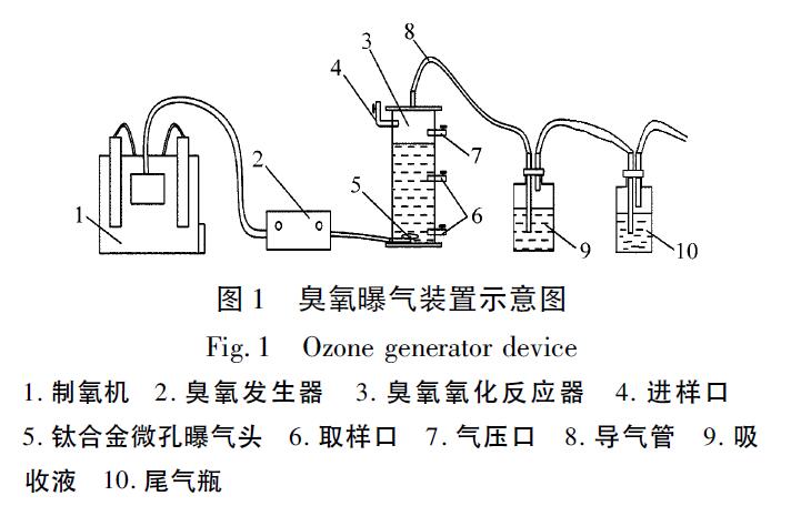03質(zhì)量濃度38~60mg/L,出氣經(jīng)過置于反應(yīng)器底部的鈦合金微孔曝氣頭進(jìn)入臭氧氧化反應(yīng)器,以20g/L的硼酸為吸收液,啟動(dòng)臭氧發(fā)生器后淀粉碘化鉀試劑開始變藍(lán)時(shí)計(jì)時(shí),臭氧尾氣由碘化鉀吸收后排放。