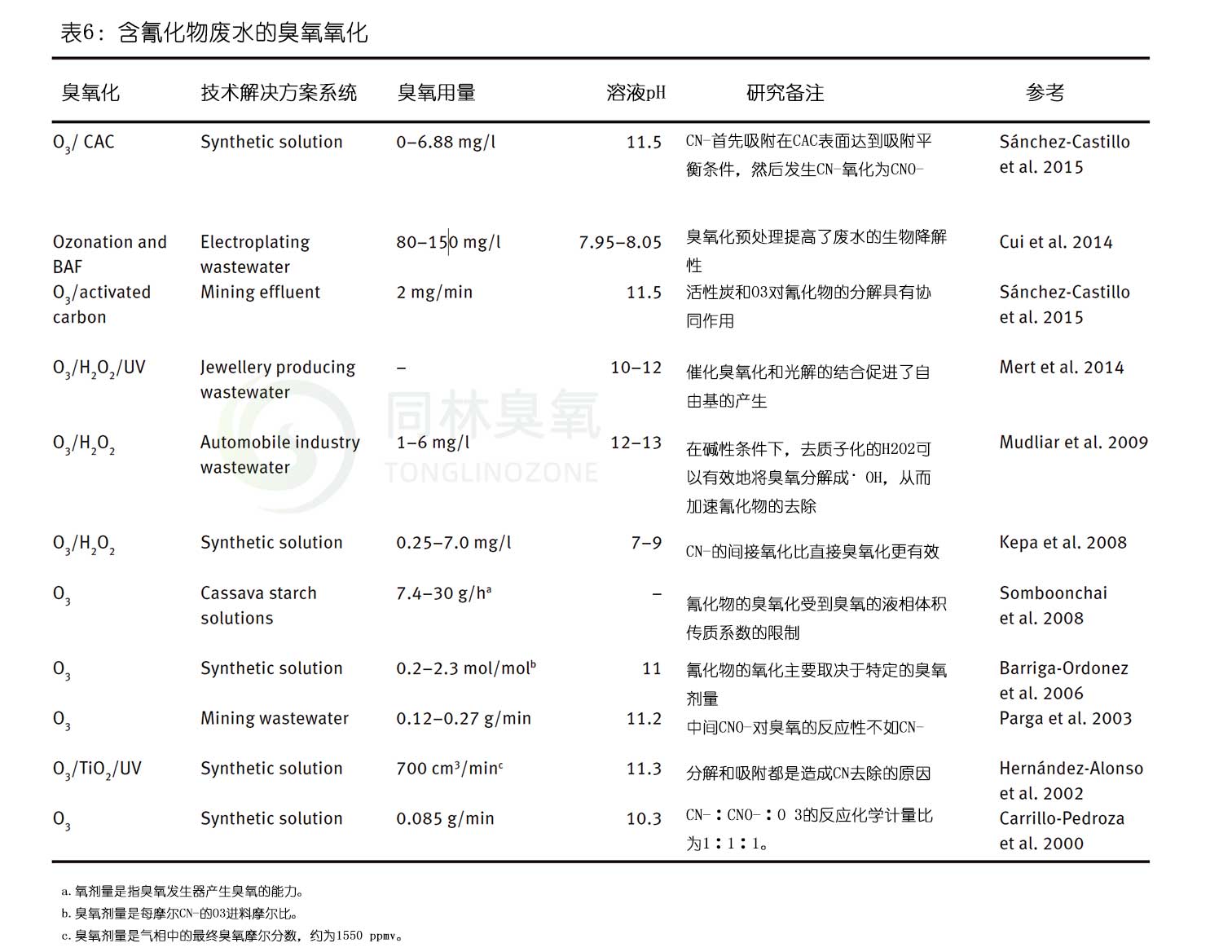 表6總結(jié)了通過(guò)催化和非催化臭氧化技術(shù)減少氰化物的研究活動(dòng)。