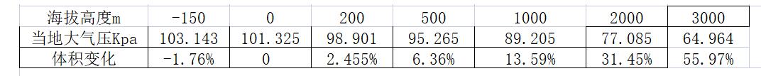 設定溫度為 0℃不變,且忽略緯度的影響,一定質量的氣體體積將隨海拔高程——當地大氣壓變化而變,其變化量如表 C.3 所示。