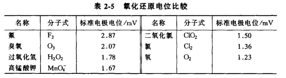 從表2-5可知,臭氧的標(biāo)準(zhǔn)電極電位除比氟低之外,比氧、氯、二氧化氯及高錳酸鉀等氧化劑都高。說明臭氧是常用氧化劑中氧化能力 很強(qiáng)的。同時,臭氧反應(yīng)后的生成物是氧氣,所以臭氧是高效的無二次污染的氧化劑。